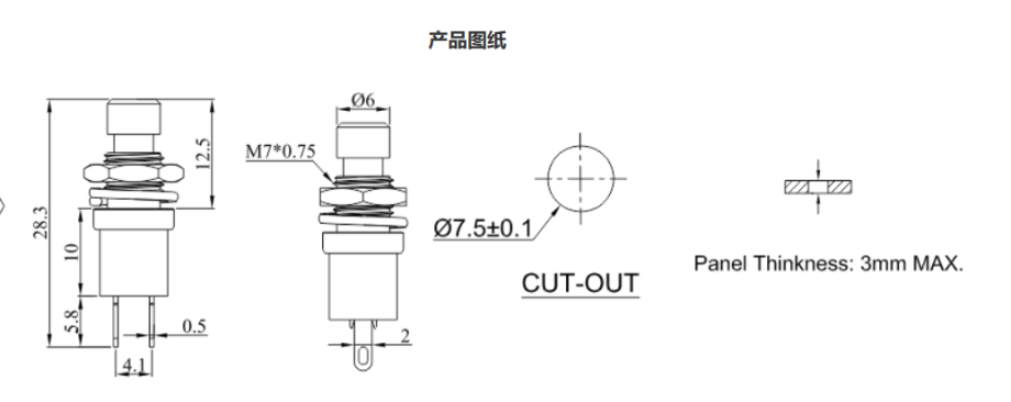 PB按鍵開關(guān)尺寸圖及參數(shù)